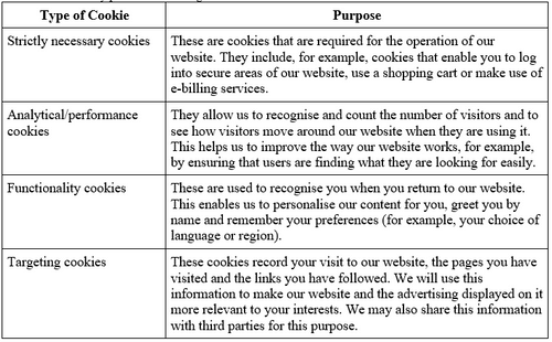 35. You can find a list of Cookies that we use in the Cookies Schedule.